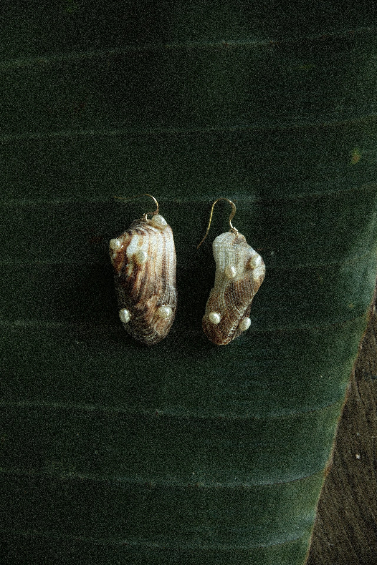 Each pair begins with tiny mussel shells, collected and treasured, then hand-set with scattered freshwater baroque pearls tucked into their natural curves. Every shell holds its own little constellation — imperfect, glowing, deliciously organic.
