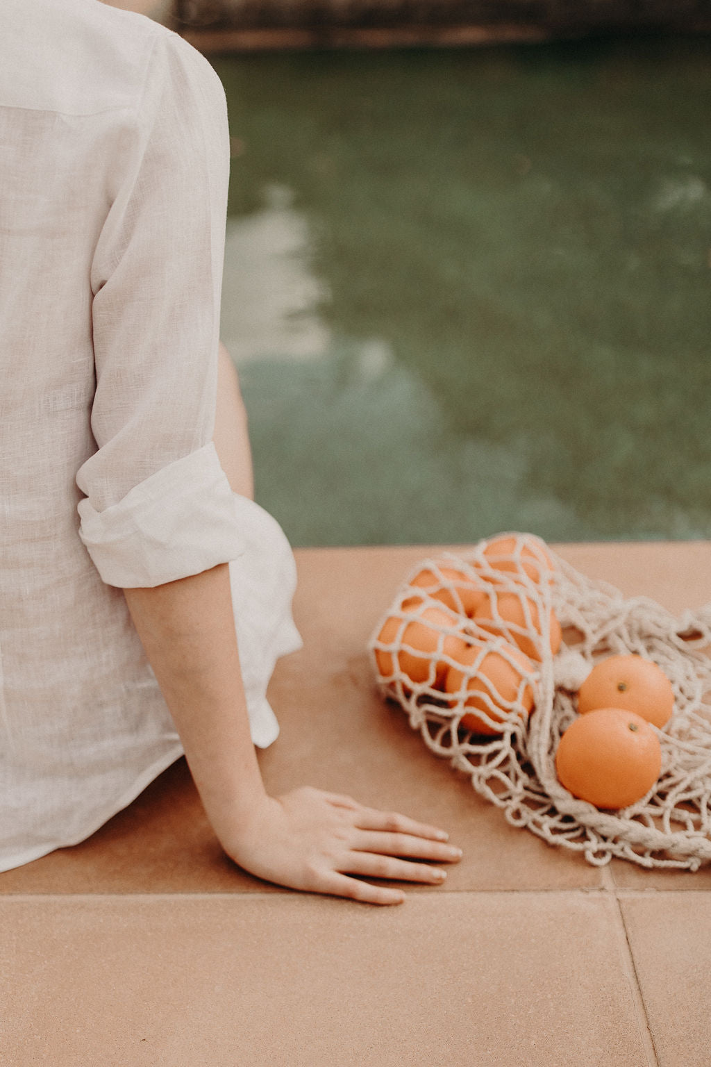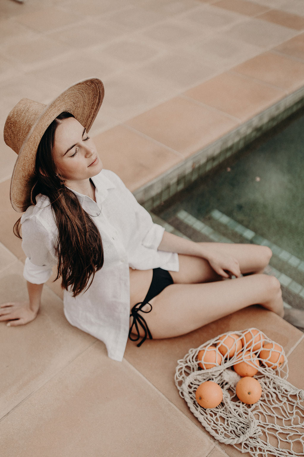 This blouse is semi fitted but true to size. Chloe wears a size 6 and Gorgia wears a size 10. We recommend going your usual size. If you float between sizes, go the smaller for a more fitted look or go the larger size for a more relaxed look.