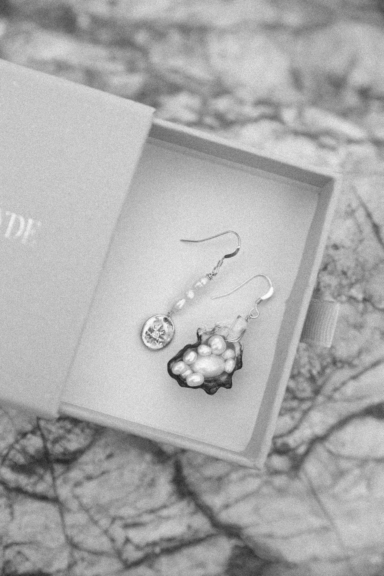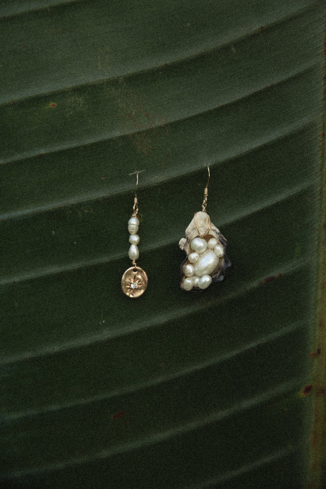 One side is a full oyster-shell drop, hand-set with a lush large baroque pearl and scattered with smaller baroque pearls tucked into every natural curve. It’s textured, opulent, and quietly dramatic — the kind of piece that looks like it washed up from someones vintage treasure trove.