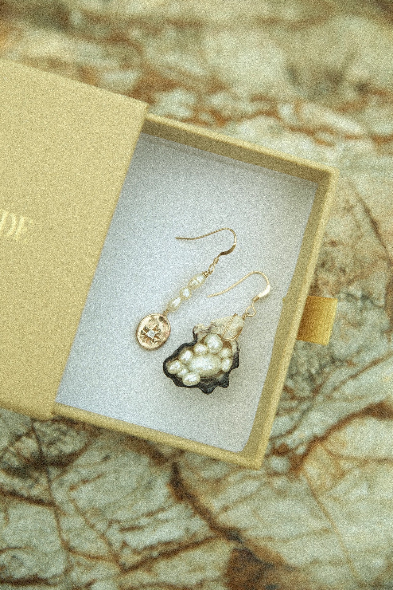 The other side keeps things delicate and poetic: a slim 14k gold-filled drop set with three baroque pearls in a soft vertical line, finished with a tiny handmade gold-plated charm and a sparkling cubic zirconia star. A little celestial wink.